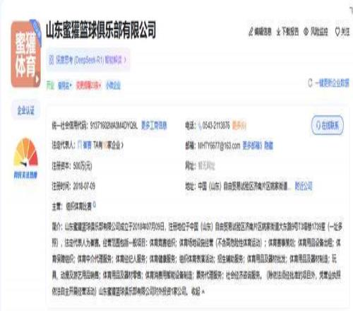 公开资料显示,山东蜜獾篮球俱乐部成立于2018年,总部位于济南,注册资本500万元,法人代表崔赛。该公司经营范围:体育竞赛组织、赛事策划、体育用品制造与销售等。